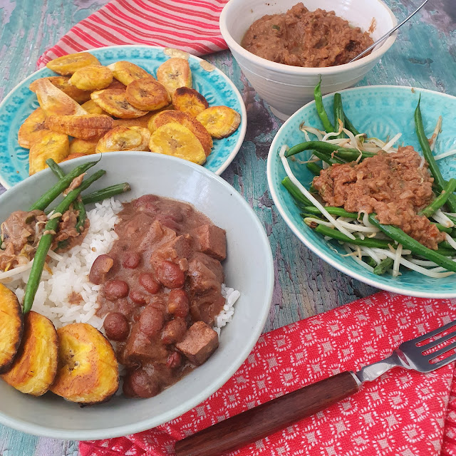 Bruine Bonen, or brown beans, is a hearty dish that reflects the country’s rich cultural heritage. It is made with tender brown beans stewed with meat and accompanied with vegetables and rice. It belies its influences from Africa, the Netherlands and India. Usually the dish involves salt beef, chicken and smoked pork sausage so to veganise it I used smoked tofu and lion's mane mushrooms which I marinaded to get a more umami flavour.